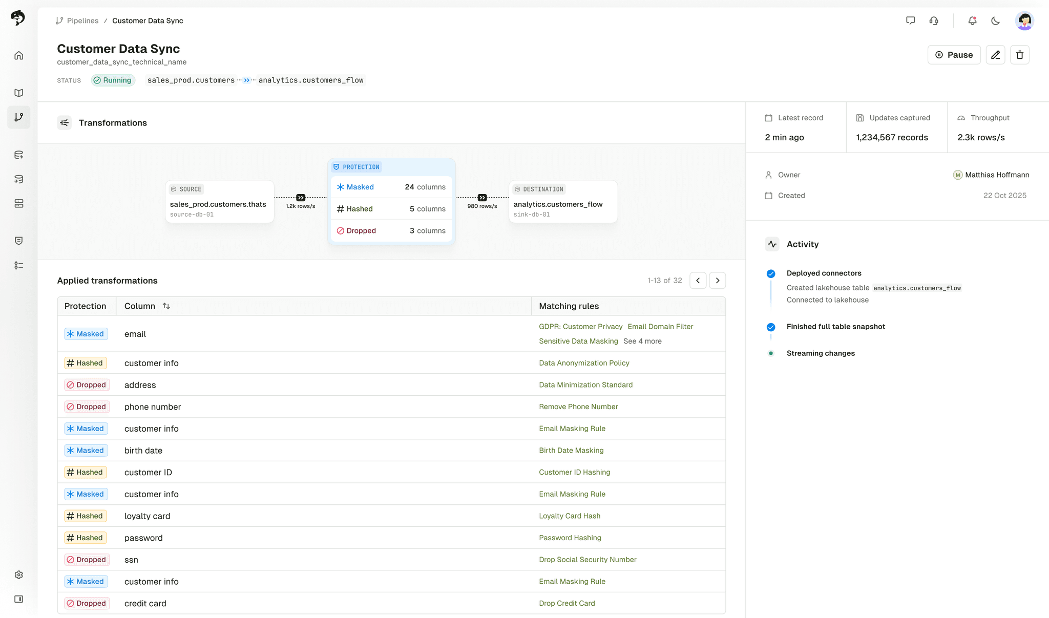 Your ML models keep receiving features, dashboards stay up-to-date, and data keeps flowing even as operational databases evolve, without manual intervention.