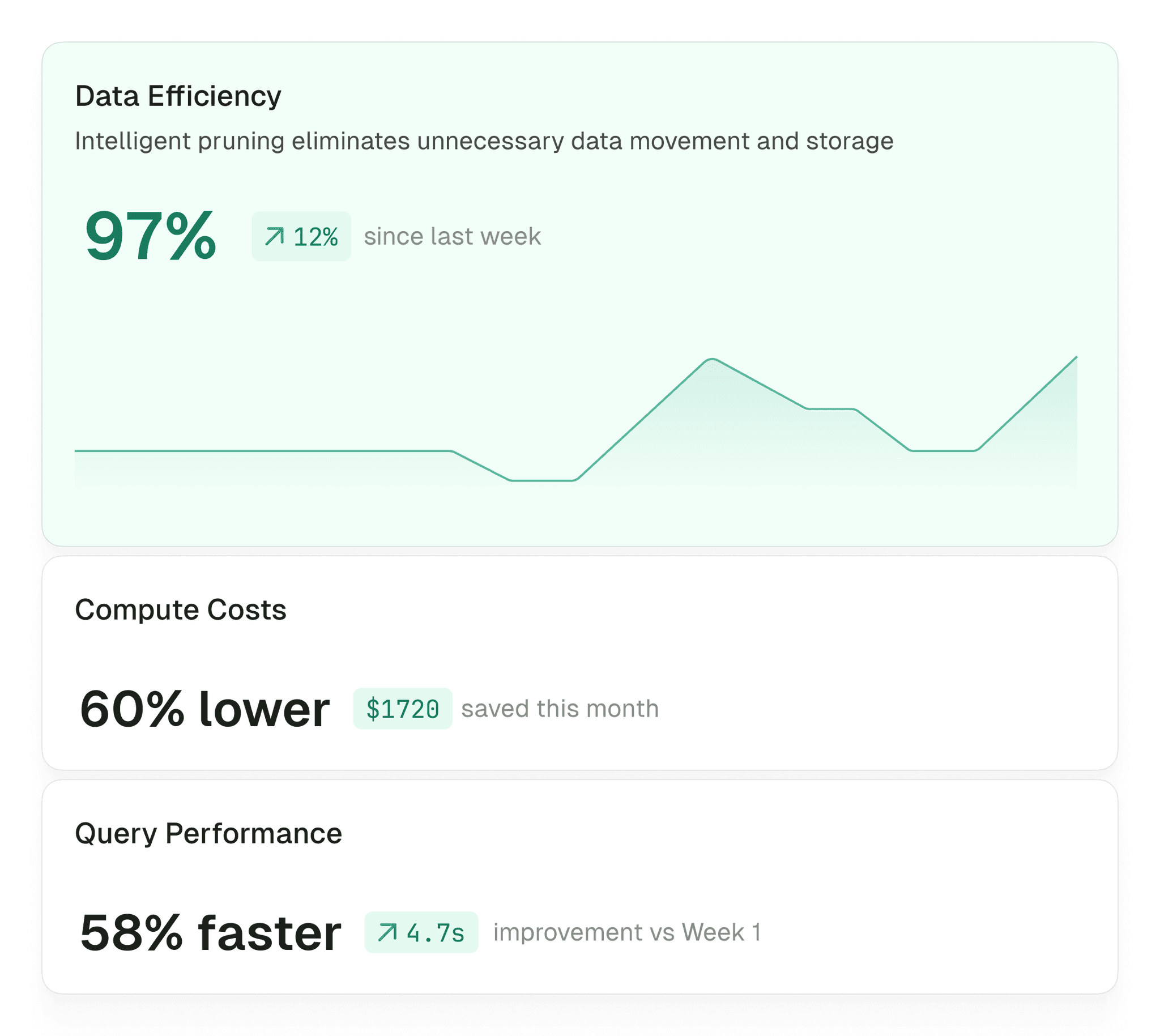 The system automatically tunes file layouts and partitions, detects unused data and adjusts what gets moved, reducing waste and cost. Data movement improves over time instead of degrading—each query teaches the system what matters.